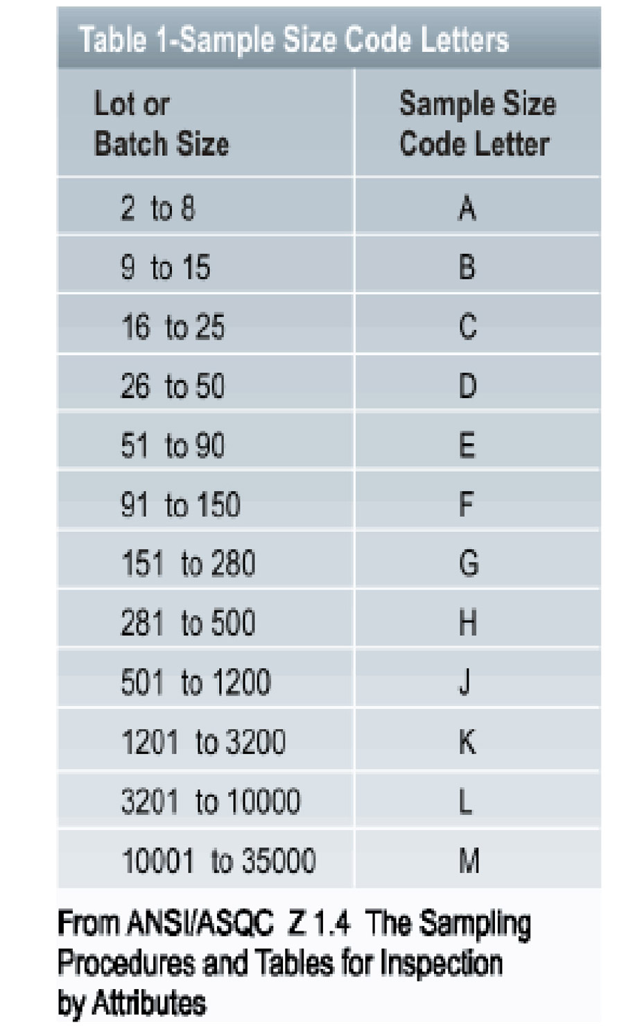 1. Look under the lot or batch size column in Table 1, and find the entry that corresponds to a quantity of 600. This will be the line where the lot or batch size is 501 to 1200. Go across this line to sample size code letter column. There is a letter “J” there.