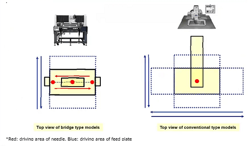 Footprints – Further, the bridge type models provide small footprint. As mentioned above, the needle (machine head) also moves in these machines which decreases the driving area of X and the same thing goes for feed plate’s movement in Y-direction so the table for setting the bed isn’t needed and it provides smaller footprint. (See Image 2)